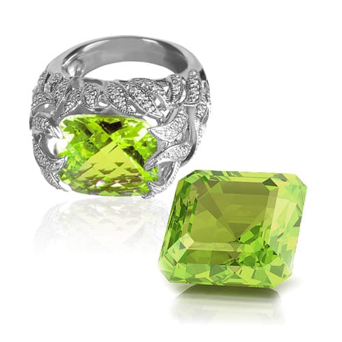 Peridot is said to host magical powers and healing properties to protect against nightmares and to bring the wearer power, influence, and a wonderful year. As peridot is a gemstone that forms deep inside the Earth and brought to the surface by volcanoes, in Hawaii, peridot symbolizes the tears of Pele, the goddess of fire and volcanoes. Today, most of the peridot supply comes from Arizona; other sources are China, Myanmar, and Pakistan. This gemstone comes in several color variations ranging from yellowish green to brown, but most consumers are attracted to the bright lime greens and olive greens. Peridot, in smaller sizes, often is used in beaded necklaces and bracelets.