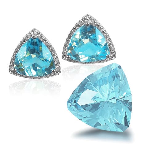 Topaz is a gemstone available in a rich rainbow of colors. Prized for several thousand years in antiquity, all yellow gems in antiquity were called topaz. Often confused with citrine quartz (yellow) and smoky quartz (brown), quartz and topaz are separate and unrelated mineral species. The most prized color of topaz is called Imperial topaz after the Russian Czars of the 1800s and features a magnificent orange body color with pinkish undertones. Topaz also comes in yellow, pink, purple, orange, and the many popular blue tones.