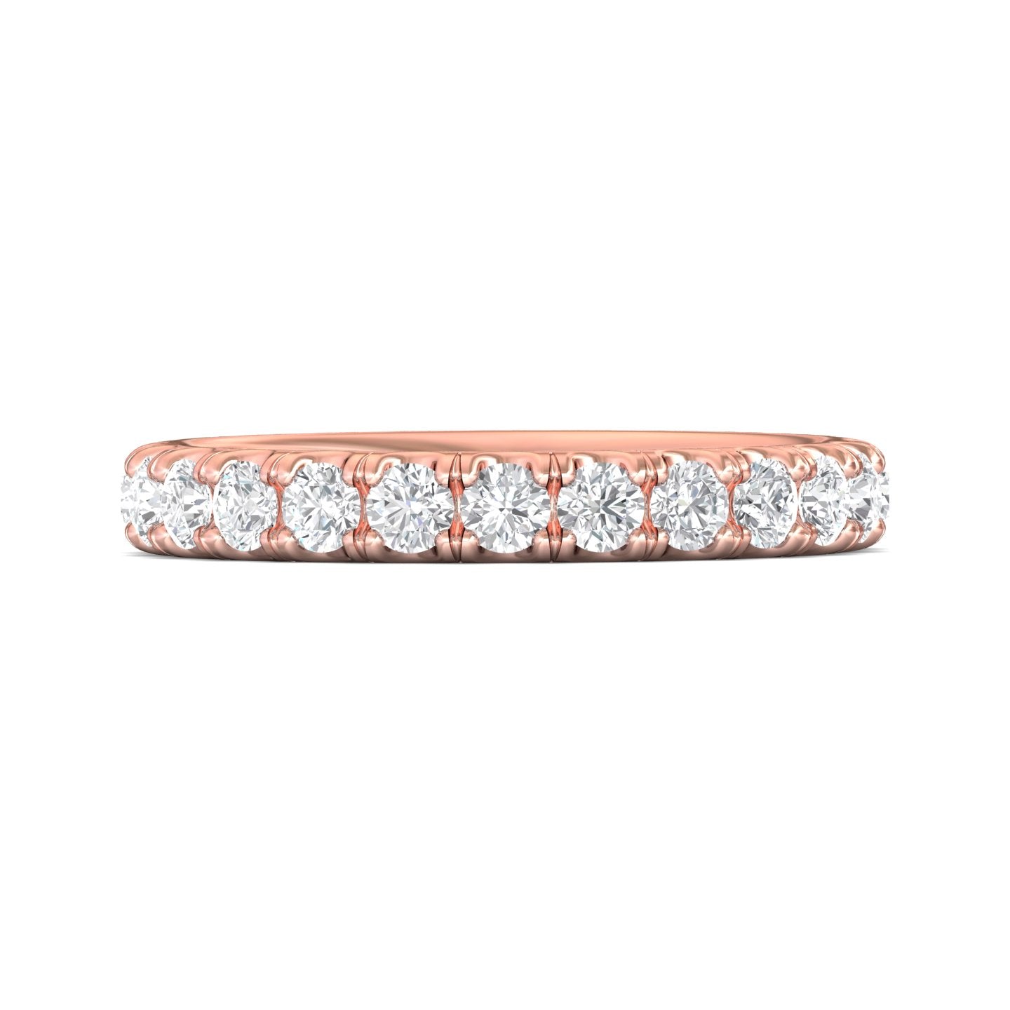 Shimmering round diamonds encircle this elegant cutdown micropavé FlyerFit eternity band. A diamond ring ideal for a wedding band or worn as a stacker.